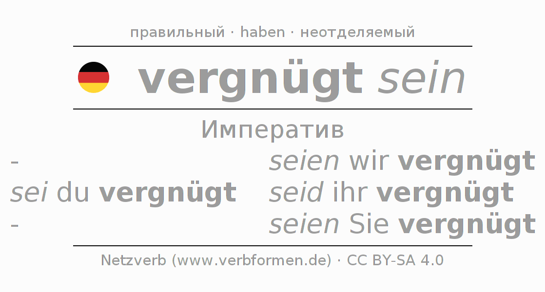 Спряжение vergnügen в Императив Презенс Повелительное наклонение Пассив с sein: sei (du) vergnügt, seien wir vergnügt, seid (ihr) vergnügt, seien Sie vergnügt.Образование этих форм происходит по определённым грамматическим правилам. Так же спрягаются простые глагольные формы vergnügen в Императив. Kомментарии ☆