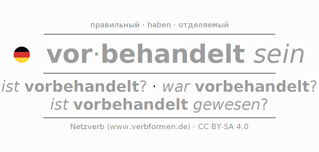 Спряжение vorbehandeln в Императив Презенс Повелительное наклонение Пассив с sein: sei (du) vorbehandelt, seien wir vorbehandelt, seid (ihr) vorbehandelt, seien Sie vorbehandelt.Образование этих форм происходит по определённым грамматическим правилам. Так же спрягаются простые глагольные формы vorbehandeln в Императив. Kомментарии ☆