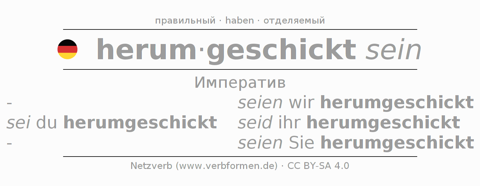 Спряжение herumschicken в Императив Презенс Повелительное наклонение Пассив с sein: sei (du) herumgeschickt, seien wir herumgeschickt, seid (ihr) herumgeschickt, seien Sie herumgeschickt.Образование этих форм происходит по определённым грамматическим правилам. Так же спрягаются простые глагольные формы herumschicken в Императив. Kомментарии ☆