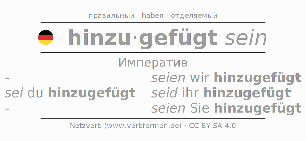 Спряжение hinzufügen в Императив Презенс Повелительное наклонение Пассив с sein: sei (du) hinzugefügt, seien wir hinzugefügt, seid (ihr) hinzugefügt, seien Sie hinzugefügt.Образование этих форм происходит по определённым грамматическим правилам. Так же спрягаются простые глагольные формы hinzufügen в Императив. Kомментарии ☆