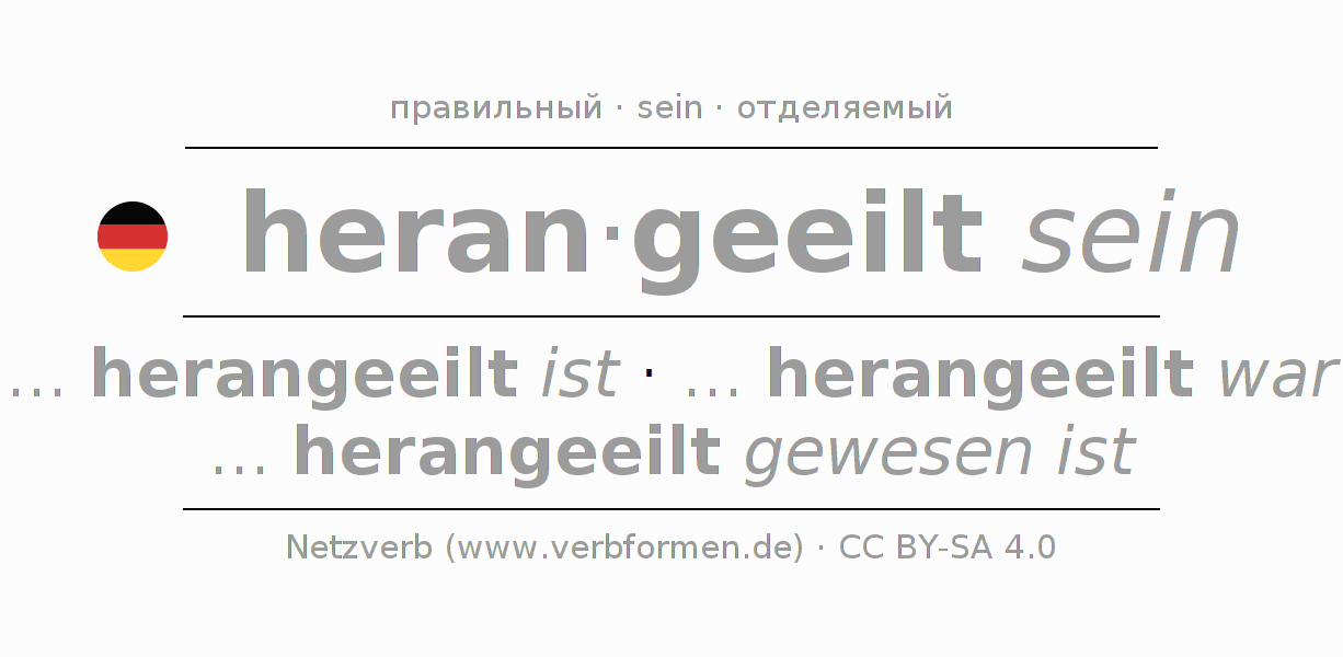 Спряжение heraneilen в Императив Презенс Повелительное наклонение Пассив с sein: sei (du) herangeeilt, seien wir herangeeilt, seid (ihr) herangeeilt, seien Sie herangeeilt.Образование этих форм происходит по определённым грамматическим правилам. Так же спрягаются простые глагольные формы heraneilen в Императив. Kомментарии ☆