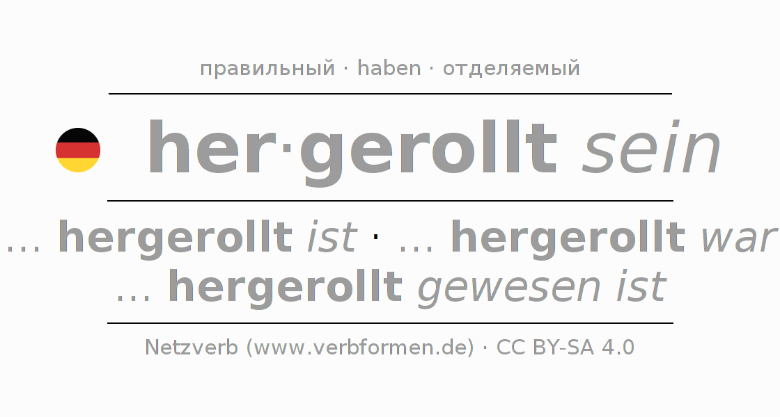 Спряжение herrollen в Императив Презенс Повелительное наклонение Пассив с sein: sei (du) hergerollt, seien wir hergerollt, seid (ihr) hergerollt, seien Sie hergerollt.Образование этих форм происходит по определённым грамматическим правилам. Так же спрягаются простые глагольные формы herrollen в Императив. Kомментарии ☆