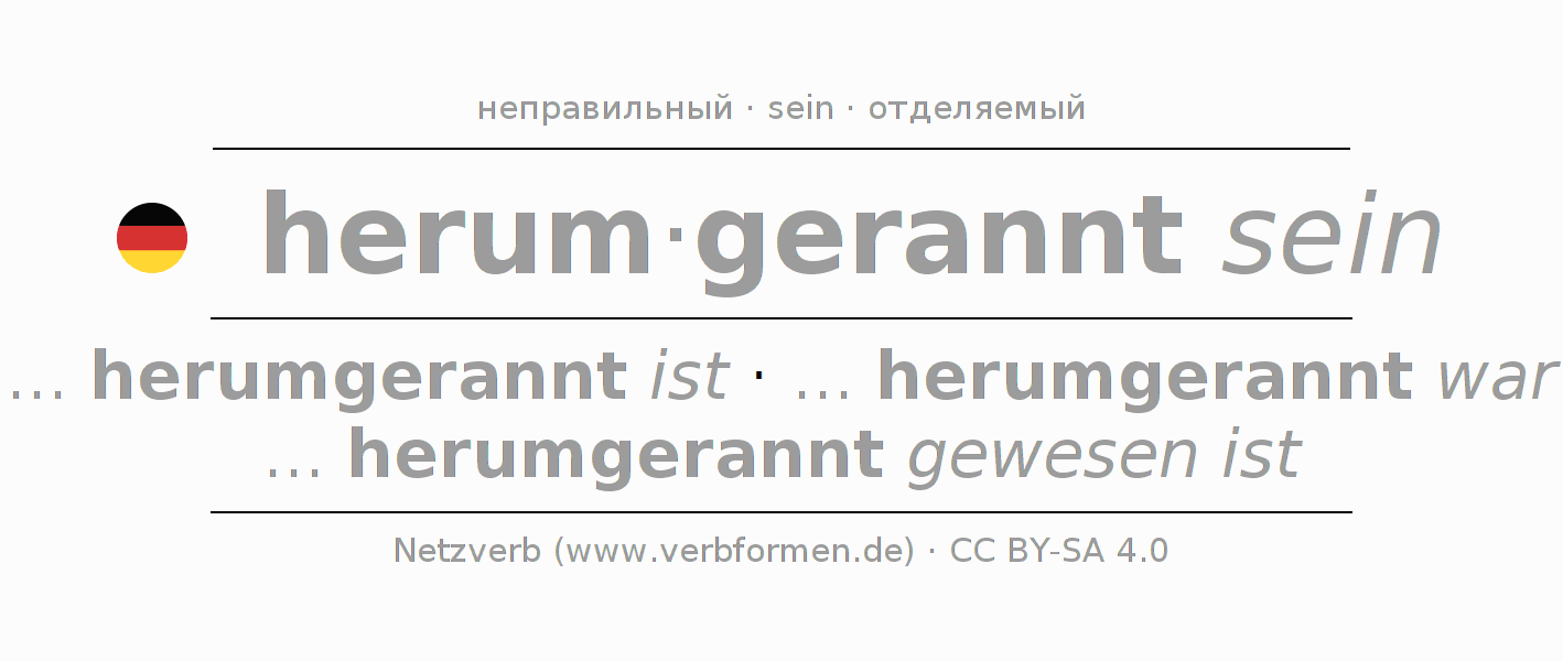 Спряжение herumrennen в Императив Презенс Повелительное наклонение Пассив с sein: sei (du) herumgerannt, seien wir herumgerannt, seid (ihr) herumgerannt, seien Sie herumgerannt.Образование этих форм происходит по определённым грамматическим правилам. Так же спрягаются простые глагольные формы herumrennen в Императив. Kомментарии ☆
