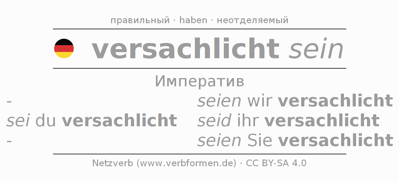 Спряжение versachlichen в Императив Презенс Повелительное наклонение Пассив с sein: sei (du) versachlicht, seien wir versachlicht, seid (ihr) versachlicht, seien Sie versachlicht.Образование этих форм происходит по определённым грамматическим правилам. Так же спрягаются простые глагольные формы versachlichen в Императив. Kомментарии ☆