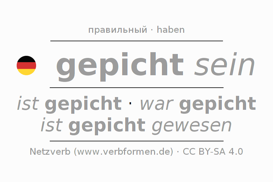 Спряжение pichen в Императив Презенс Повелительное наклонение Пассив с sein: sei (du) gepicht, seien wir gepicht, seid (ihr) gepicht, seien Sie gepicht.Образование этих форм происходит по определённым грамматическим правилам. Так же спрягаются простые глагольные формы pichen в Императив. Kомментарии ☆