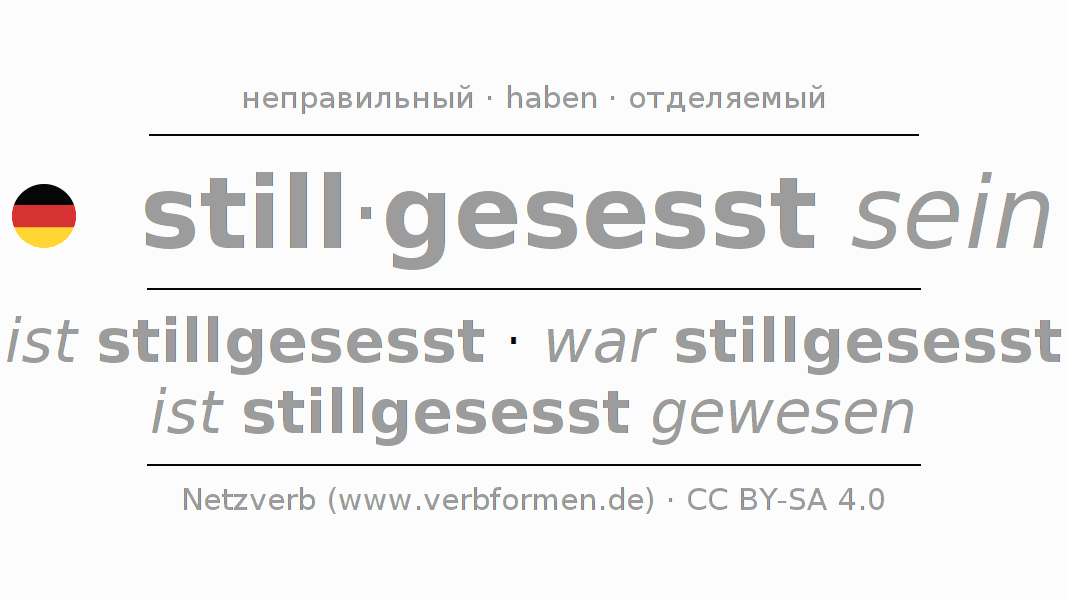 Спряжение stillsitzen в Императив Презенс Повелительное наклонение Пассив с sein: sei (du) stillgesesst, seien wir stillgesesst, seid (ihr) stillgesesst, seien Sie stillgesesst.Образование этих форм происходит по определённым грамматическим правилам. Так же спрягаются простые глагольные формы stillsitzen в Императив. Kомментарии ☆