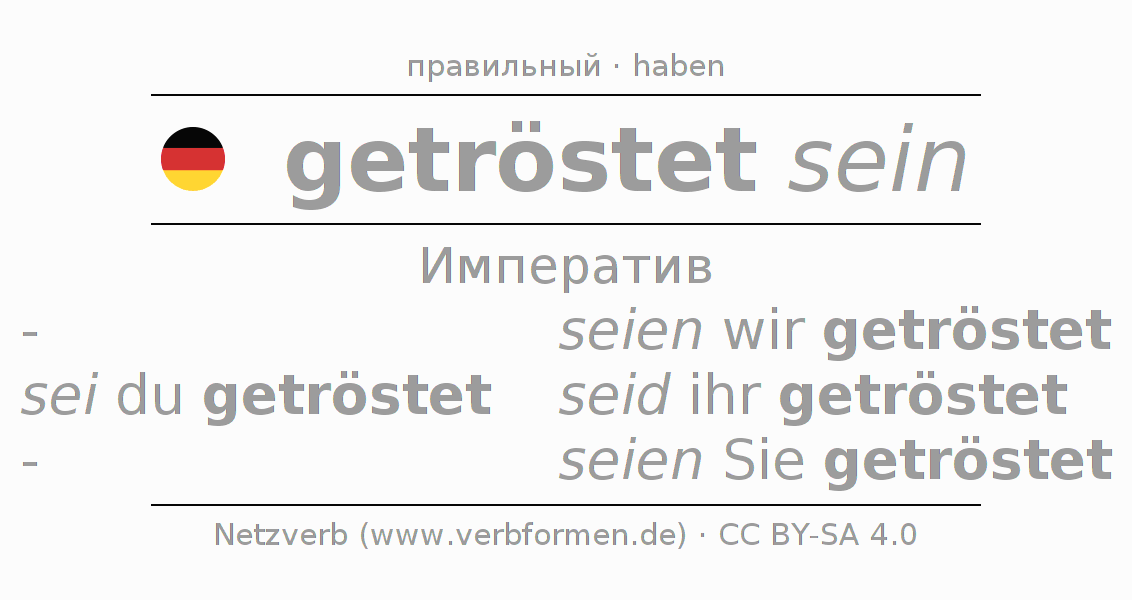 Спряжение trösten в Императив Презенс Повелительное наклонение Пассив с sein: sei (du) getröstet, seien wir getröstet, seid (ihr) getröstet, seien Sie getröstet.Образование этих форм происходит по определённым грамматическим правилам. Так же спрягаются простые глагольные формы trösten в Императив. Kомментарии ☆