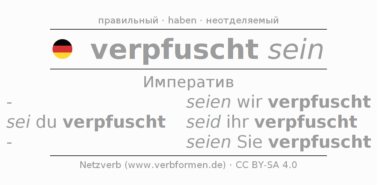 Спряжение verpfuschen в Императив Презенс Повелительное наклонение Пассив с sein: sei (du) verpfuscht, seien wir verpfuscht, seid (ihr) verpfuscht, seien Sie verpfuscht.Образование этих форм происходит по определённым грамматическим правилам. Так же спрягаются простые глагольные формы verpfuschen в Императив. Kомментарии ☆