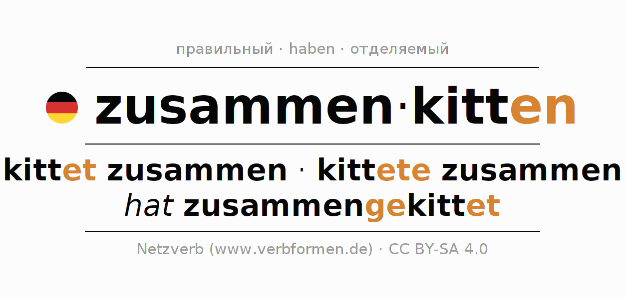 Формами спряжения zusammenkitten (склеивать, восстанавливать) в повелительном наклонении являются: kitte (du) zusammen, kitten wir zusammen, kittet (ihr) zusammen, kitten Sie zusammen