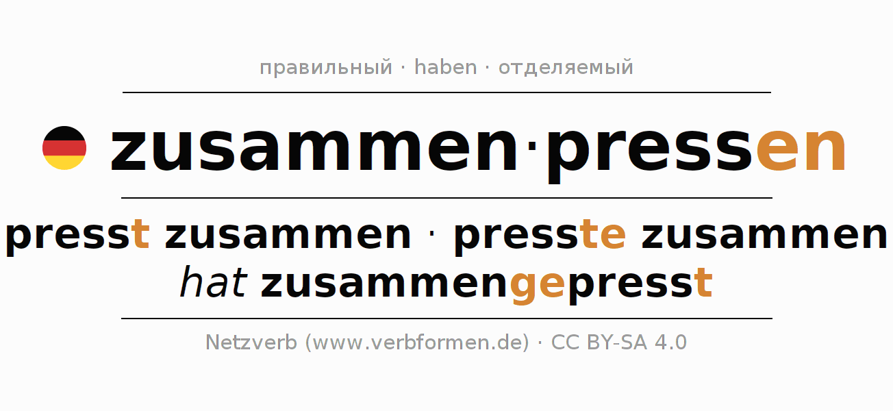 Формами спряжения zusammenpressen (сжимать, сдавливать) в повелительном наклонении являются: presse (du) zusammen, pressen wir zusammen, presst (ihr) zusammen, pressen Sie zusammen