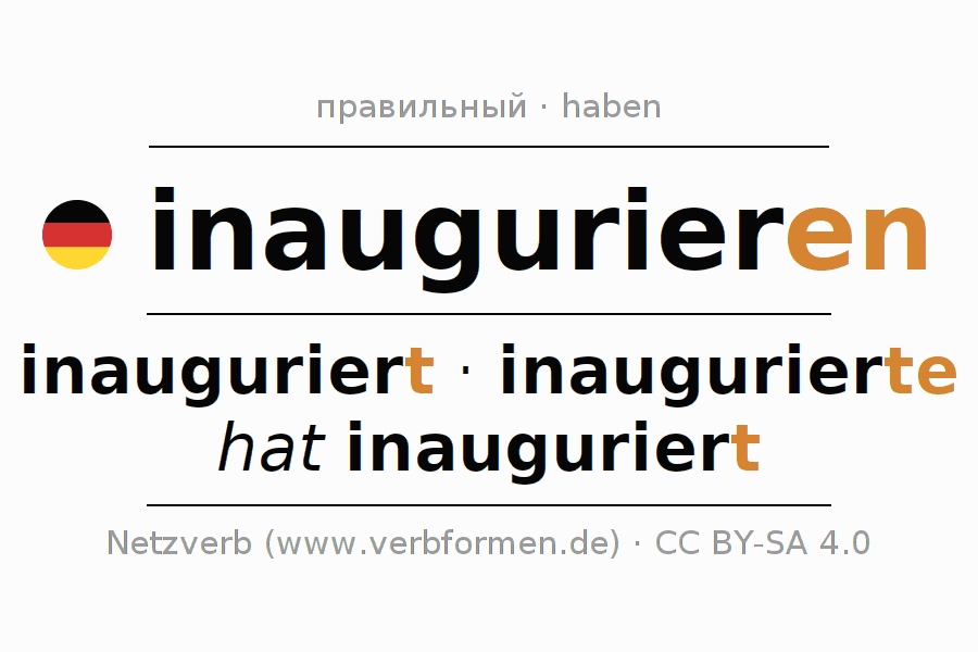 - Перфект: ich habe inauguriert, du hast inauguriert, er hat inauguriert, wir haben inauguriert, ihr habt inauguriert, sie haben inauguriert