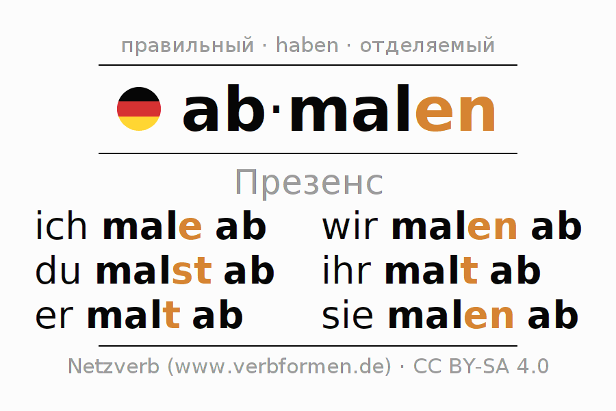 Спряжение abmalen (копировать, перерисовывать) в настоящем времени Презенс: ich male ab, du malst ab, er malt ab, wir malen ab, ihr malt ab, sie malen ab