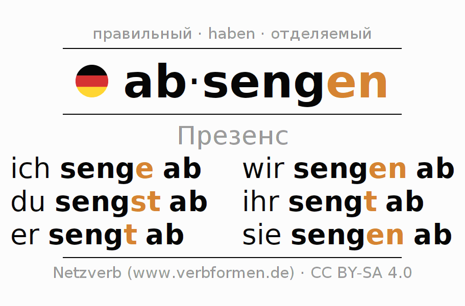 Спряжение absengen (выжечь, выжигать) в настоящем времени Презенс: ich senge ab, du sengst ab, er sengt ab, wir sengen ab, ihr sengt ab, sie sengen ab