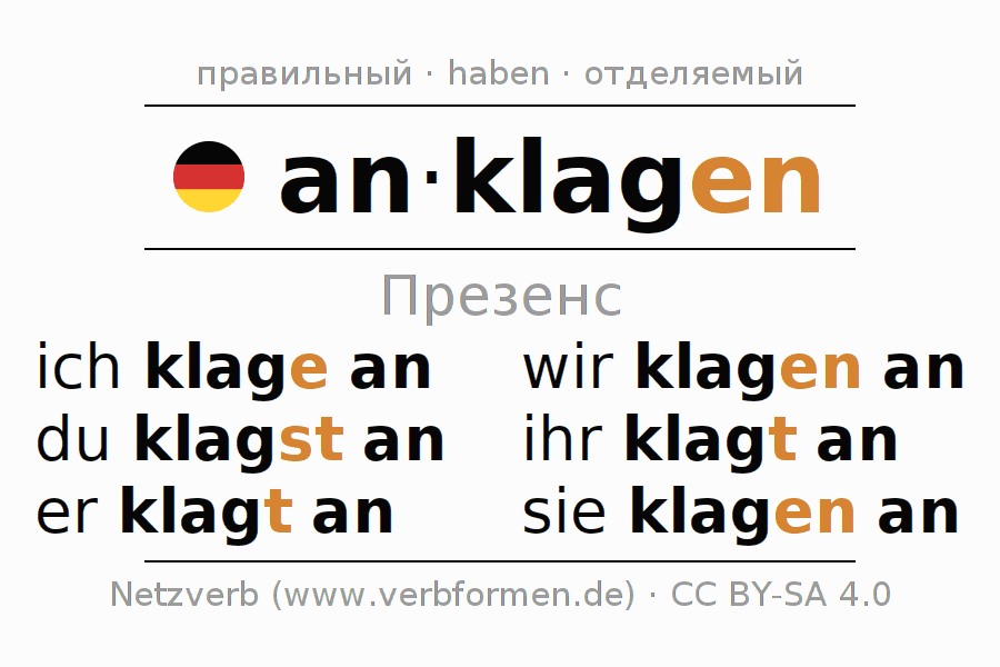 Спряжение anklagen (обвинять, предъявлять обвинение) в настоящем времени Презенс: ich klage an, du klagst an, er klagt an, wir klagen an, ihr klagt an, sie klagen an