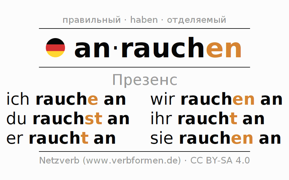 Спряжение anrauchen (закуривать, закурить) в настоящем времени Презенс: ich rauche an, du rauchst an, er raucht an, wir rauchen an, ihr raucht an, sie rauchen an