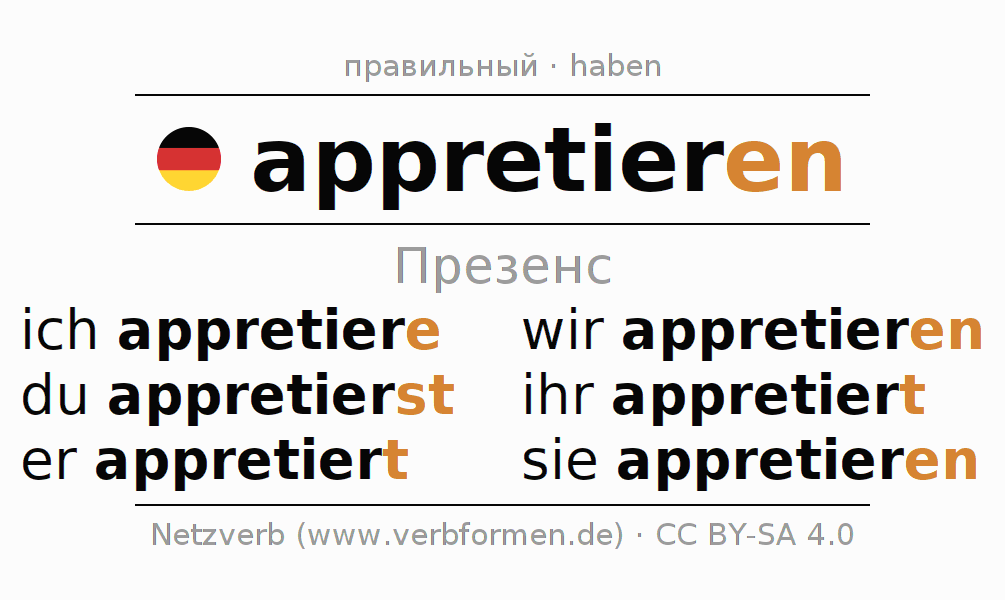 Спряжение appretieren (аппретировать, обработка тканей) в настоящем времени Презенс: ich appretiere, du appretierst, er appretiert, wir appretieren, ihr appretiert, sie appretieren