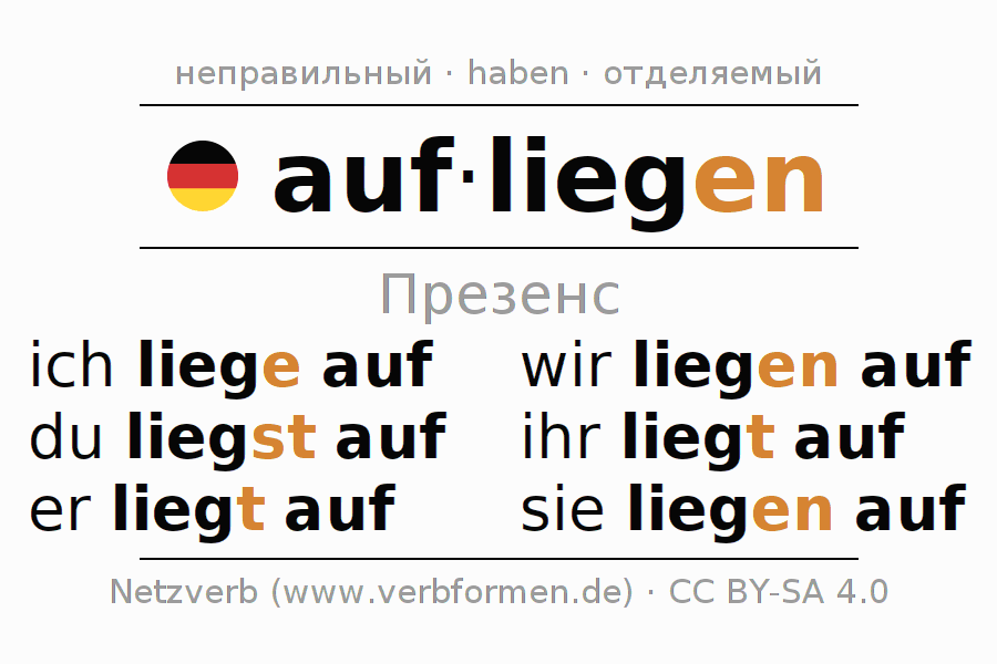 Спряжение aufliegen (лежать, быть возложенным) в настоящем времени Презенс: ich liege auf, du liegst auf, er liegt auf, wir liegen auf, ihr liegt auf, sie liegen auf