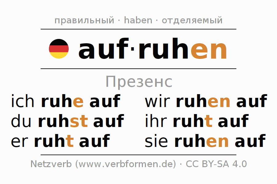 Спряжение aufruhen (лежать, покоиться) в настоящем времени Презенс: ich ruhe auf, du ruhst auf, er ruht auf, wir ruhen auf, ihr ruht auf, sie ruhen auf