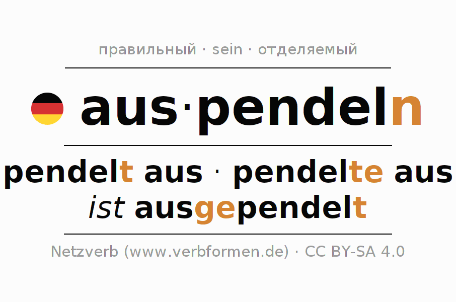 Спряжение auspendeln (выравнивать по отвесу, выровнять по отвесу) в настоящем времени Презенс: ich pend(e)le aus, du pendelst aus, er pendelt aus, wir pendeln aus, ihr pendelt aus, sie pendeln aus