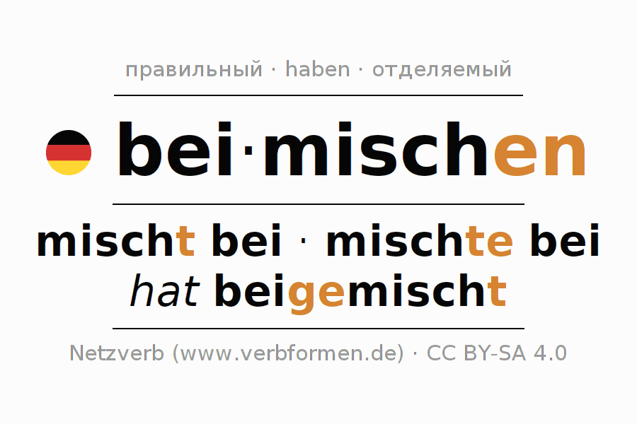 Спряжение beimischen (вмешивать, добавлять) в настоящем времени Презенс: ich mische bei, du mischst bei, er mischt bei, wir mischen bei, ihr mischt bei, sie mischen bei