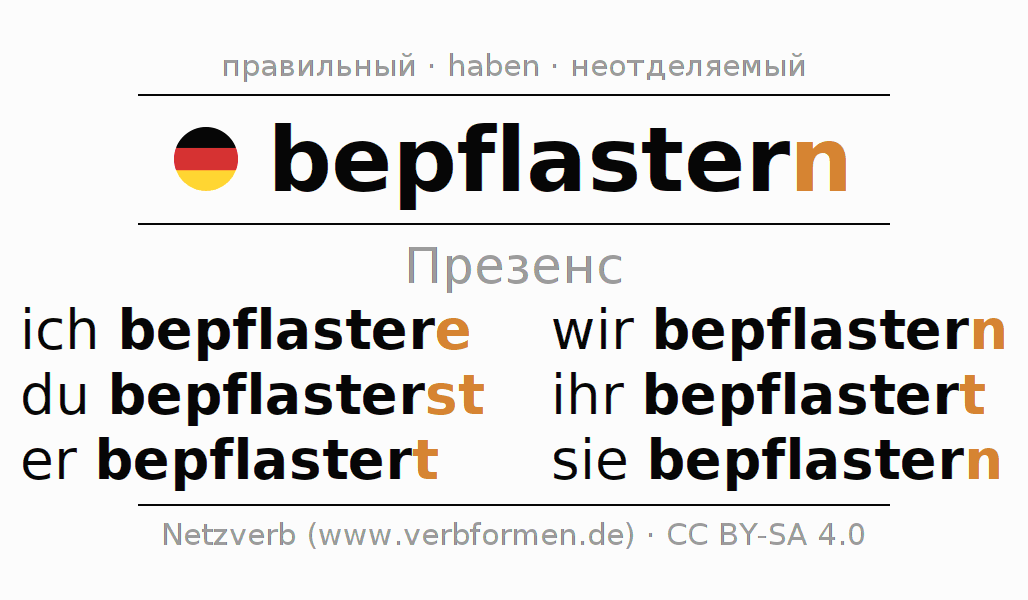 Спряжение bepflastern (застилать, покрывать) в настоящем времени Презенс: ich bepflast(e)re, du bepflasterst, er bepflastert, wir bepflastern, ihr bepflastert, sie bepflastern