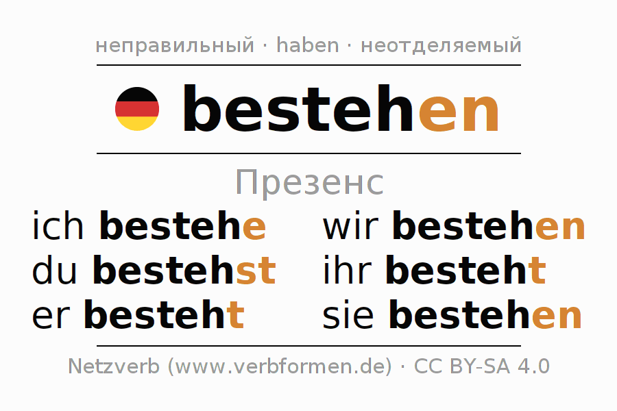 Спряжение bestehen (состоять, выдержать) в настоящем времени Презенс: ich bestehe, du bestehst, er besteht, wir bestehen, ihr besteht, sie bestehen