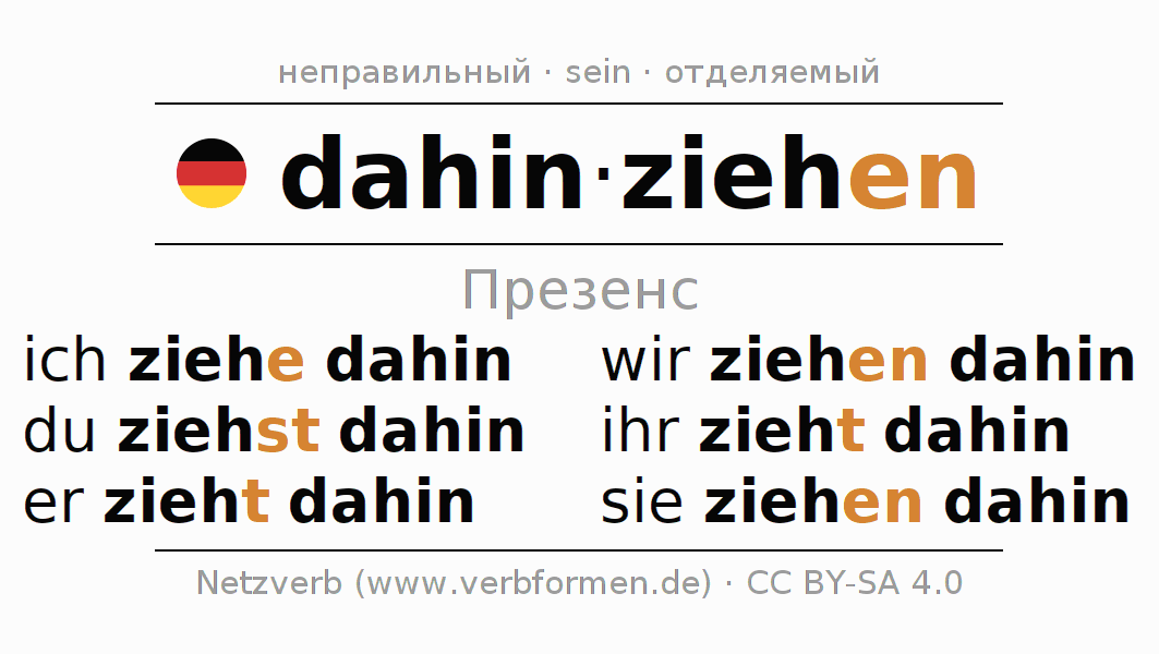 Спряжение dahinziehen (тянуться, двигаться вперёд) в настоящем времени Презенс: ich ziehe dahin, du ziehst dahin, er zieht dahin, wir ziehen dahin, ihr zieht dahin, sie ziehen dahin
