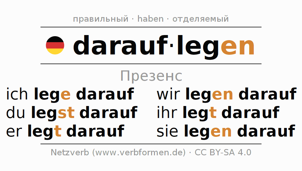 Спряжение darauflegen (класть, положить) в настоящем времени Презенс: ich lege darauf, du legst darauf, er legt darauf, wir legen darauf, ihr legt darauf, sie legen darauf
