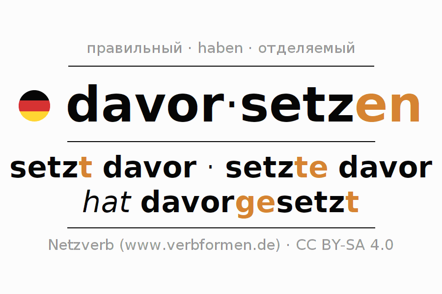 Спряжение davorsetzen (представить) в настоящем времени Презенс: ich setze davor, du setzt davor, er setzt davor, wir setzen davor, ihr setzt davor, sie setzen davor