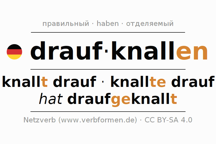 Спряжение draufknallen (резко повышать цену, стрелять) в настоящем времени Презенс: ich knalle drauf, du knallst drauf, er knallt drauf, wir knallen drauf, ihr knallt drauf, sie knallen drauf