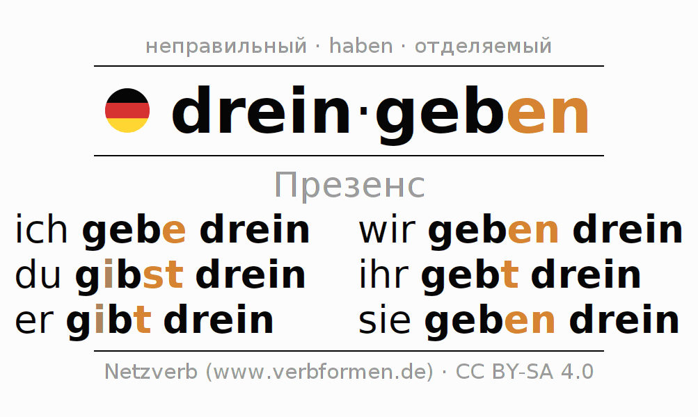 Спряжение dreingeben (отказаться) в настоящем времени Презенс: ich gebe drein, du gibst drein, er gibt drein, wir geben drein, ihr gebt drein, sie geben drein