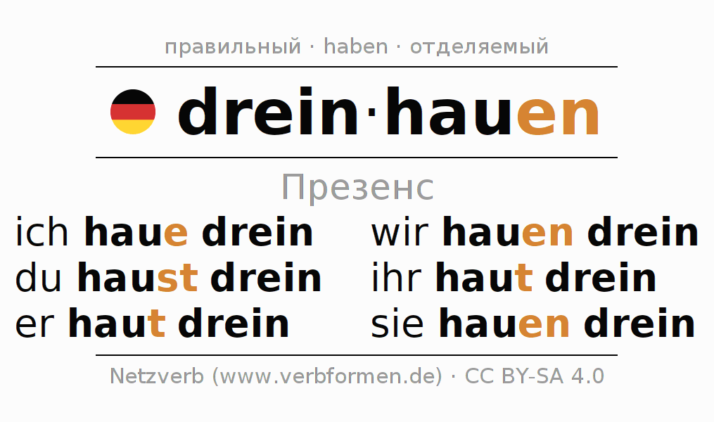 Спряжение dreinhauen (сильно схватить, сильно ударить) в настоящем времени Презенс: ich haue drein, du haust drein, er haut drein, wir hauen drein, ihr haut drein, sie hauen drein