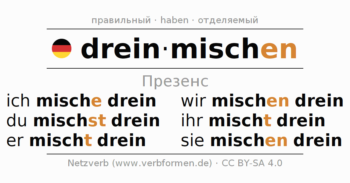 Спряжение dreinmischen (вмешиваться) в настоящем времени Презенс: ich mische drein, du mischst drein, er mischt drein, wir mischen drein, ihr mischt drein, sie mischen drein