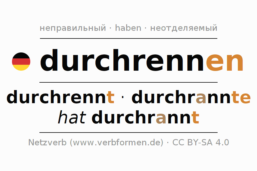 Спряжение durchrennen (пробежать, обегать) в настоящем времени Презенс: ich durchrenne, du durchrennst, er durchrennt, wir durchrennen, ihr durchrennt, sie durchrennen