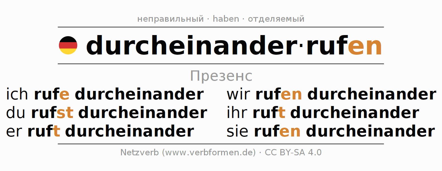 Спряжение durcheinanderrufen (перепутать, смешать) в настоящем времени Презенс: ich rufe durcheinander, du rufst durcheinander, er ruft durcheinander, wir rufen durcheinander, ihr ruft durcheinander, sie rufen durcheinander