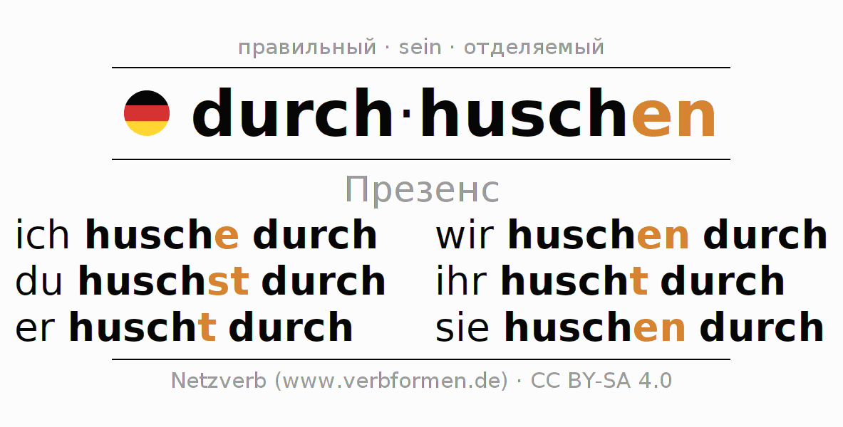Спряжение durchhuschen (проскользнуть, пройти незаметно) в настоящем времени Презенс: ich husche durch, du huschst durch, er huscht durch, wir huschen durch, ihr huscht durch, sie huschen durch