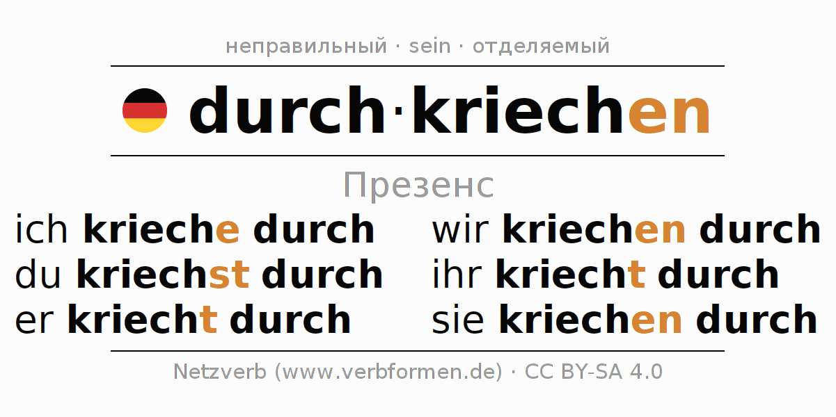 Спряжение durchkriechen (проползать, облазить) в настоящем времени Презенс: ich krieche durch, du kriechst durch, er kriecht durch, wir kriechen durch, ihr kriecht durch, sie kriechen durch