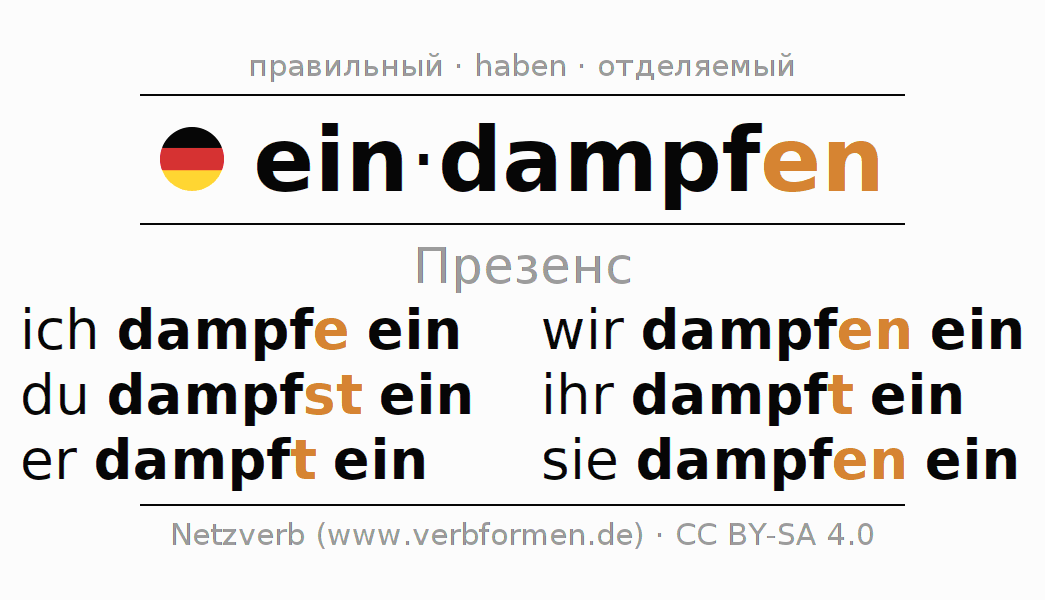 Спряжение eindampfen (выпаривать, концентрировать) в настоящем времени Презенс: ich dampfe ein, du dampfst ein, er dampft ein, wir dampfen ein, ihr dampft ein, sie dampfen ein