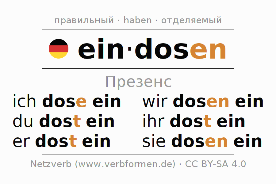 Спряжение eindosen (консервировать) в настоящем времени Презенс: ich dose ein, du dost ein, er dost ein, wir dosen ein, ihr dost ein, sie dosen ein
