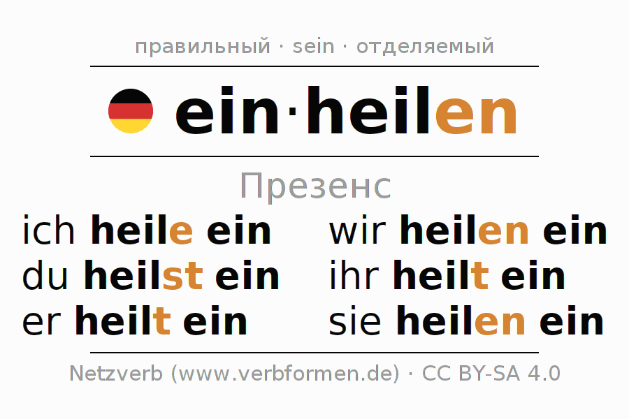 Спряжение einheilen (заживать, врастать) в настоящем времени Презенс: ich heile ein, du heilst ein, er heilt ein, wir heilen ein, ihr heilt ein, sie heilen ein