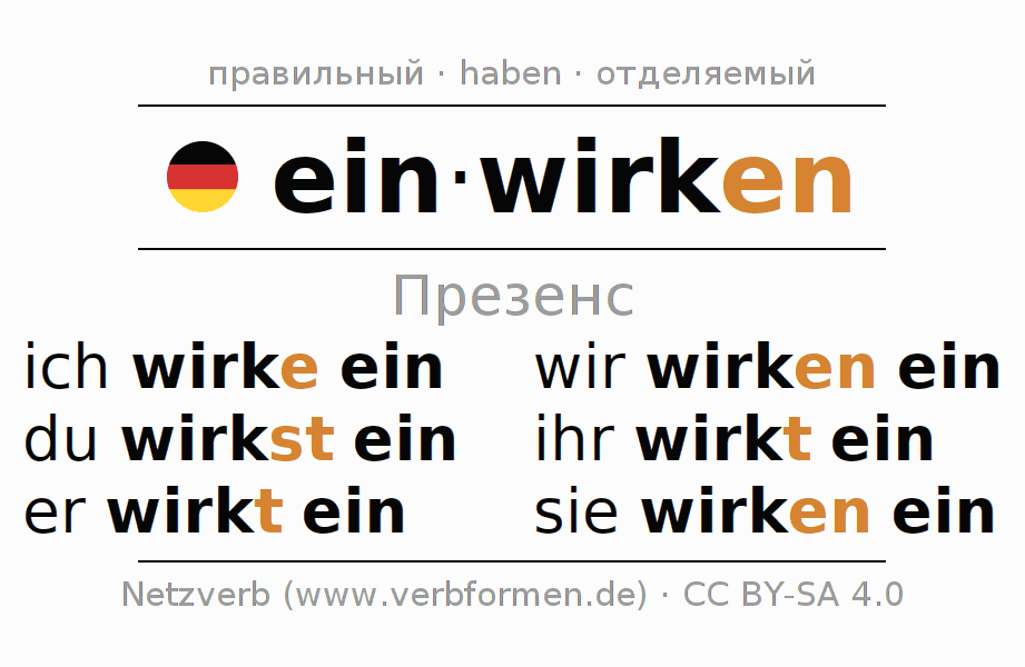 Спряжение einwirken (влиять, воздействовать) в настоящем времени Презенс: ich wirke ein, du wirkst ein, er wirkt ein, wir wirken ein, ihr wirkt ein, sie wirken ein