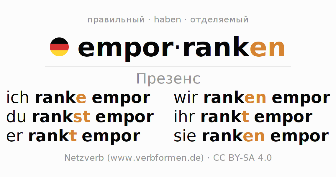 Спряжение emporranken (взбираться, виться) в настоящем времени Презенс: ich ranke empor, du rankst empor, er rankt empor, wir ranken empor, ihr rankt empor, sie ranken empor
