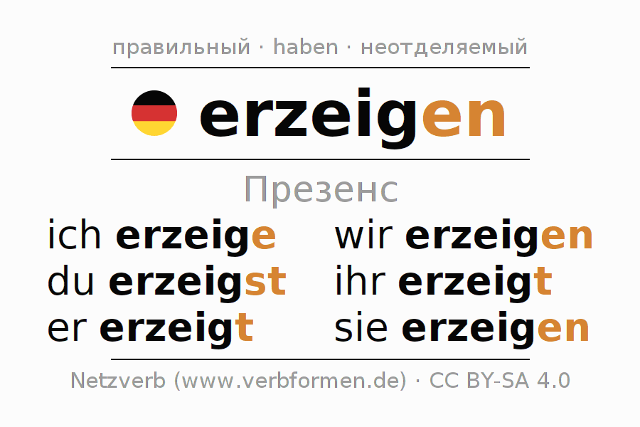 Спряжение erzeigen (выражать, выявляться) в настоящем времени Презенс: ich erzeige, du erzeigst, er erzeigt, wir erzeigen, ihr erzeigt, sie erzeigen