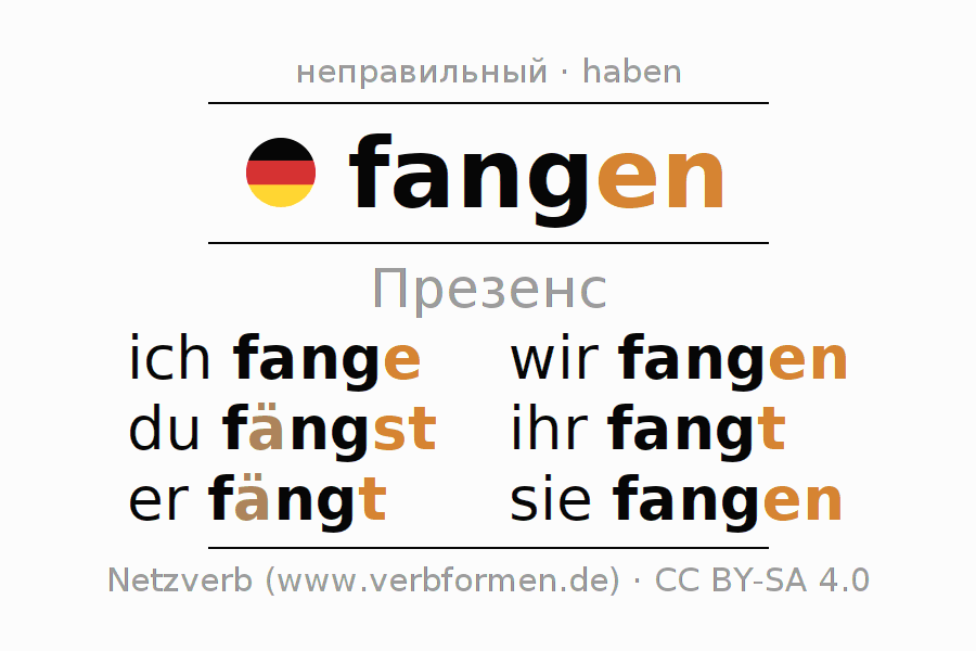 Спряжение fangen (поймать, ловить) в настоящем времени Презенс: ich fange, du fängst, er fängt, wir fangen, ihr fangt, sie fangen