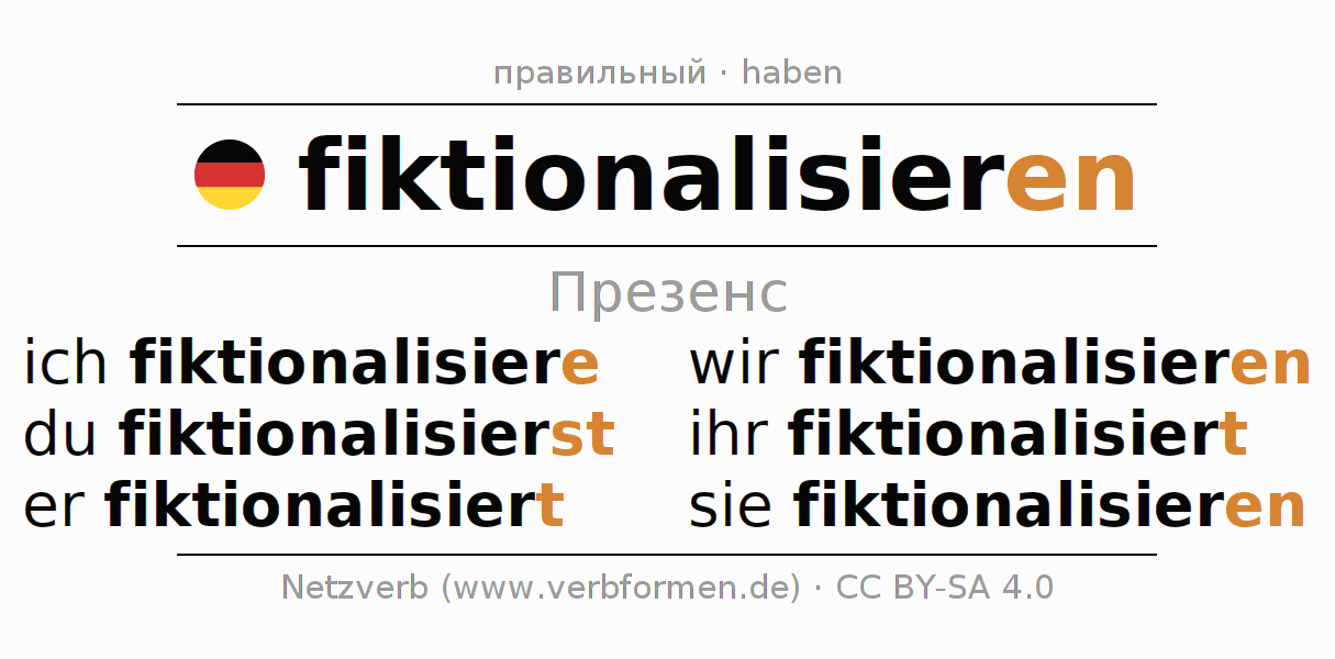 Спряжение fiktionalisieren (фантазировать, фикционализировать) в настоящем времени Презенс: ich fiktionalisiere, du fiktionalisierst, er fiktionalisiert, wir fiktionalisieren, ihr fiktionalisiert, sie fiktionalisieren