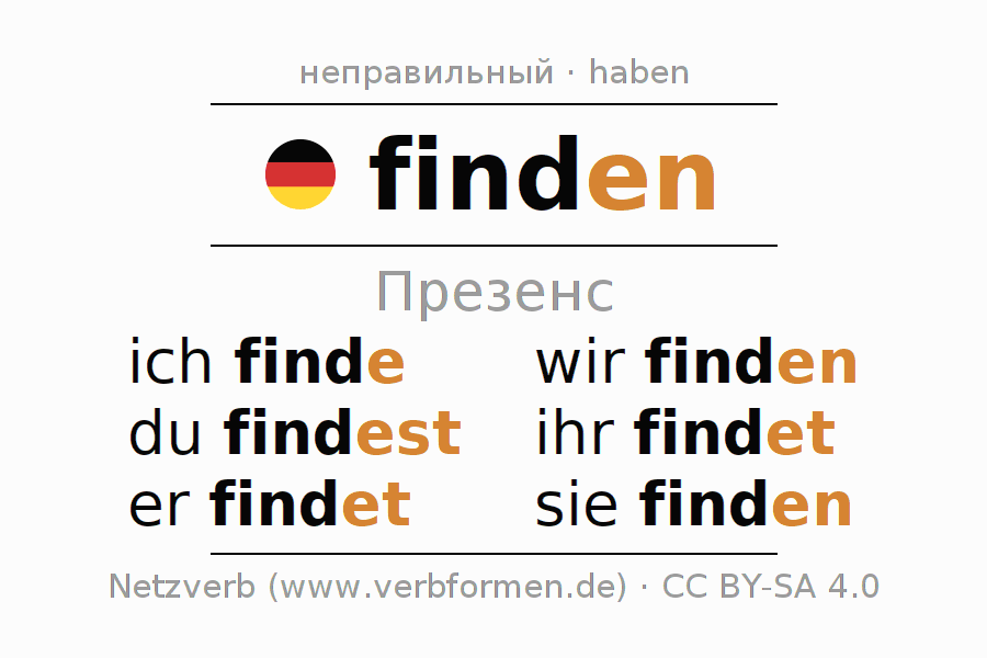 Спряжение finden (находить, найти) в настоящем времени Презенс: ich finde, du findest, er findet, wir finden, ihr findet, sie finden