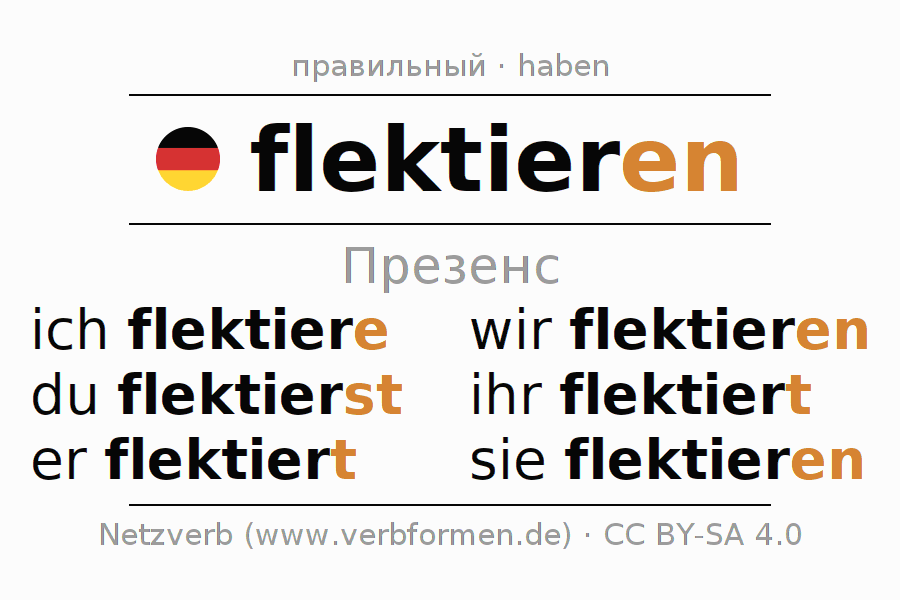 Спряжение flektieren (склонять, спрягать) в настоящем времени Презенс: ich flektiere, du flektierst, er flektiert, wir flektieren, ihr flektiert, sie flektieren