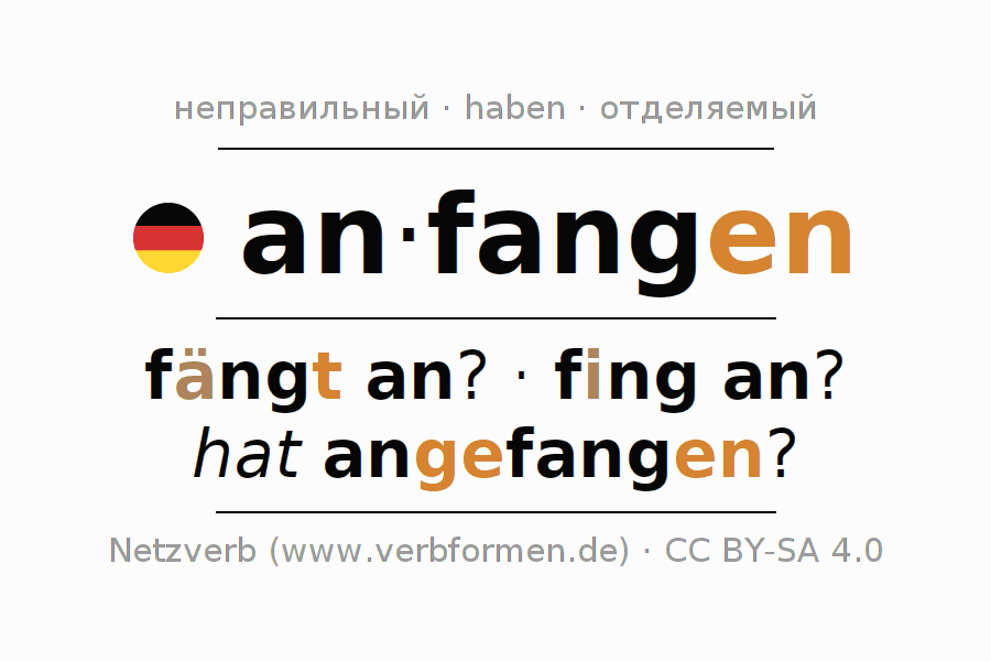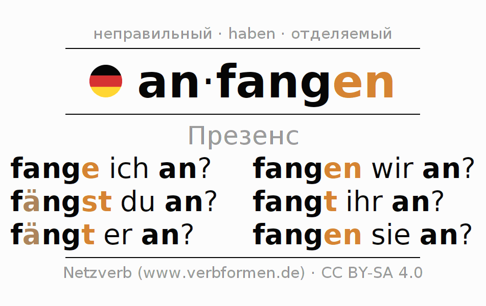 Спряжение anfangen в Презенс Индикатив Настоящее время Действительный залог (актив): fange ich an?, fängst du an?, fängt er an?, fangen wir an?, fangt ihr an?, fangen sie an?.Образование этих форм происходит по определённым грамматическим правилам. Так же спрягаются простые глагольные формы anfangen в Презенс. Kомментарии ☆