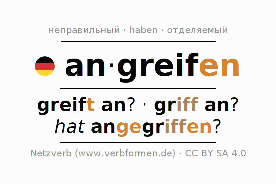 Спряжение angreifen в Презенс Индикатив Настоящее время Действительный залог (актив): greife ich an?, greifst du an?, greift er an?, greifen wir an?, greift ihr an?, greifen sie an?.Образование этих форм происходит по определённым грамматическим правилам. Так же спрягаются простые глагольные формы angreifen в Презенс. Kомментарии ☆
