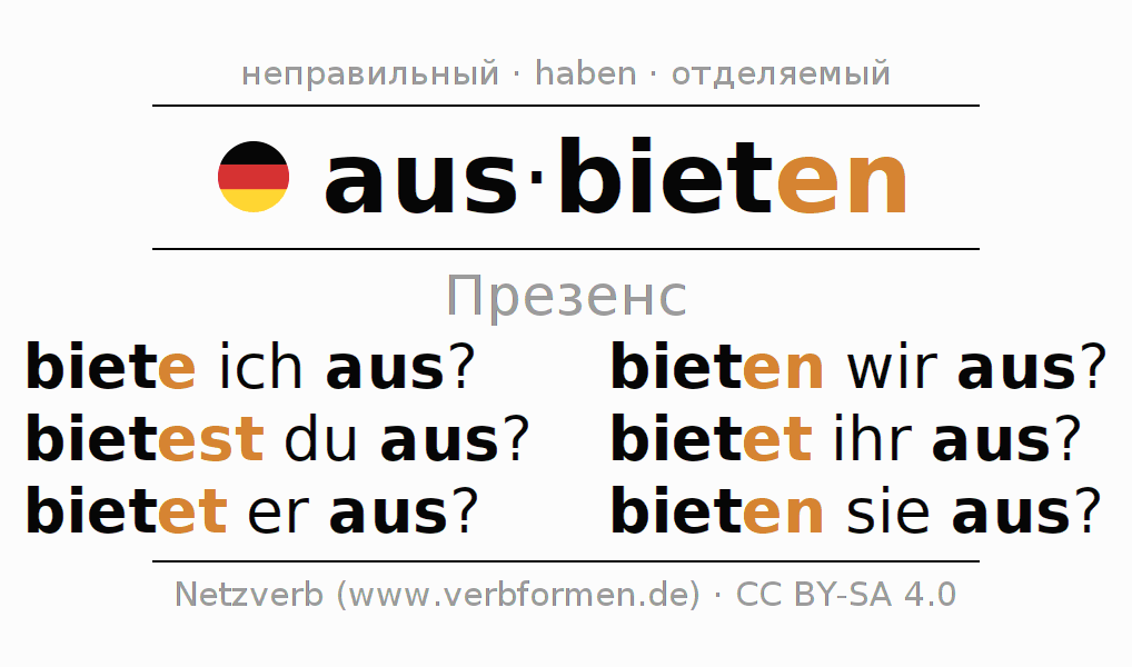 Спряжение ausbieten в Презенс Индикатив Настоящее время Действительный залог (актив): biete ich aus?, bietest du aus?, bietet er aus?, bieten wir aus?, bietet ihr aus?, bieten sie aus?.Образование этих форм происходит по определённым грамматическим правилам. Так же спрягаются простые глагольные формы ausbieten в Презенс. Kомментарии ☆